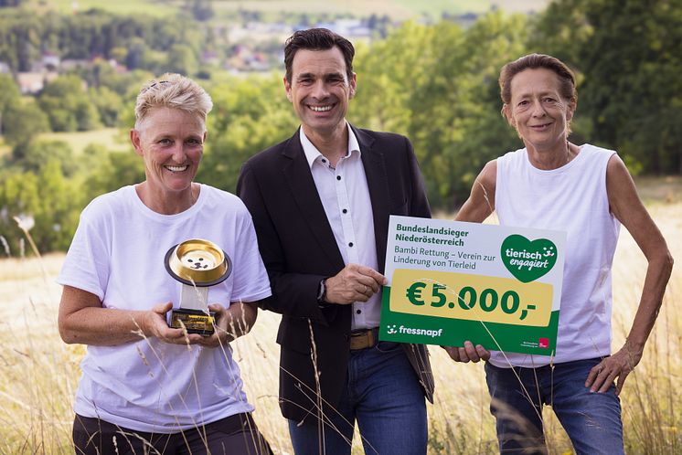 Die „Bambii Rettung - Verein zur Linderung von Tierleid“ sucht und pflegt Tiere in Not (v.l.n.r. Claudia Barbara Jarnig, Obfrau und Kassier, Jürgen Seiwaldstätter, Fressnapf Österreich, Monika Grünberger, Obfrau Stellvertreterin und Schriftführerin).