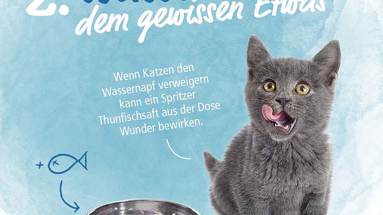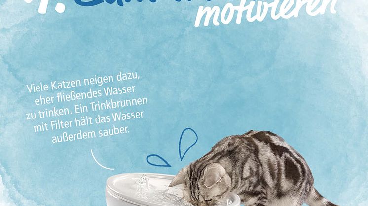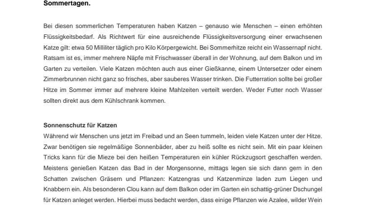 Bei diesen sommerlichen Temperaturen haben Katzen – genauso wie Menschen – einen erhöhten Flüssigkeitsbedarf. Als Richtwert für eine ausreichende Flüssigkeitsversorgung einer erwachsenen Katze gilt: etwa 50 Milliliter täglich pro Kilo Körpergewicht. Bei Sommerhitze reicht ein Wassernapf nicht. Ratsam ist es, immer mehrere Näpfe mit Frischwasser überall in der Wohnung, auf dem Balkon und im Garten zu verteilen. Viele Katzen möchten auch aus einer Gießkanne, einem Untersetzer oder einem Zimmerbrunnen nicht ganz so frisches, aber sauberes Wasser trinken. Die Futterration sollte bei großer Hitze im Sommer immer auf mehrere kleine Mahlzeiten verteilt werden. Weder Futter noch Wasser sollten direkt aus dem Kühlschrank kommen.