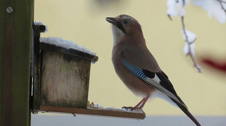 Eichelhäher: Der Eichelhäher ist ein echter Allesfresser. Im Herbst sammelt er Eicheln und vergräbt sie im Boden. Das Angebot an Futterhäuschen nimmt er als bequeme Möglichkeit zur Nahrungsmittelbeschaffung gerne an. Copyright: Christina Danninger